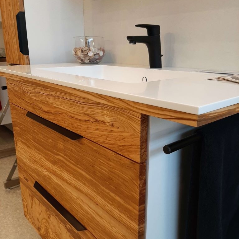 Ansehen, Erfühlen und sich inspirieren lassen. Auf 80 m² präsentieren wir Badmöbel, Tische, Stühle, Couchtische, TV-Wohnzimmer-Wand und Regalsysteme — alles selbst entworfen und gefertigt.